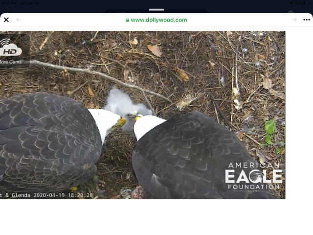 Here are two screenshots I took while I was watching on 4/49/2020. One was of the dad feeding the eaglet. The second shows the eaglet and the unhatched egg with Glenda and Grant in the nest watching over them.