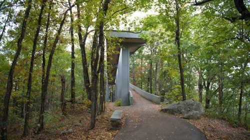 Cross the Parkway on the designated crosswalk to reach the trailhead. The short trail is paved the whole way. The path gains a little elevation (less than 200 feet). Most people will find this a pretty easy walk. During the winter months, the trail can be slippery due to icy conditions, so be careful.
